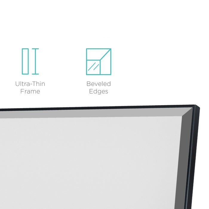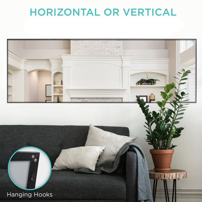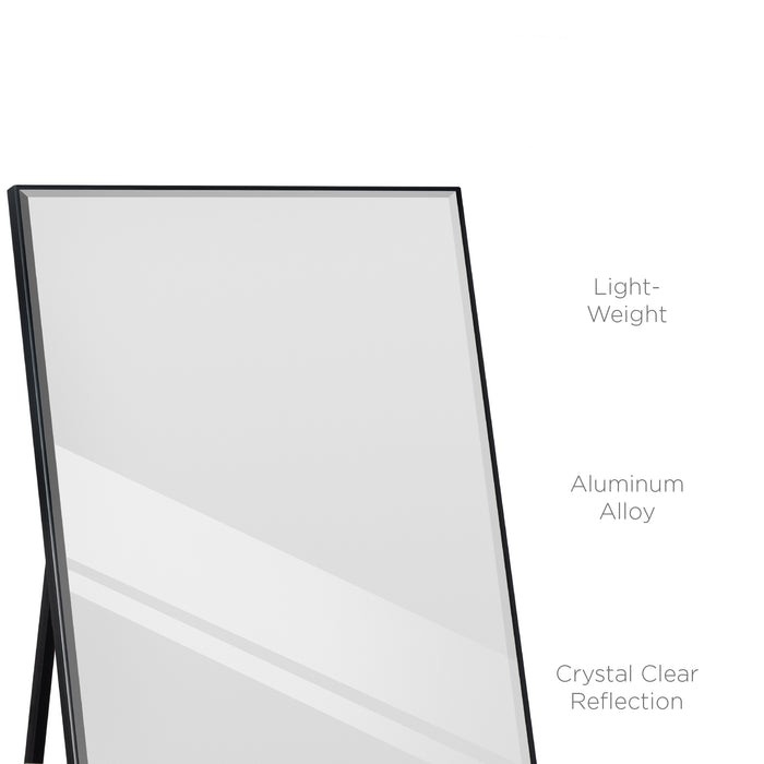 Customize your wall space by placing the mirror horizontally for a wide view, or set it up vertically to get a longer glimpse of yourself with this Black Full Length Leaning Wall Hanging Mirror. Designed with hook holes on each side of the frame, as well as a hinged fold-out support stand, this mirror provides multiple setup options and includes all necessary hardware; easily hang it or stand it up. Mirror's edges are smoothly cut and polished to a specific angle and size, giving the mirror an elegant touch that adds a piece of charm to any room. This mirror is durably crafted with aluminum alloy and a thin, aluminum frame for a lightweight design that makes it easy to take to any room.